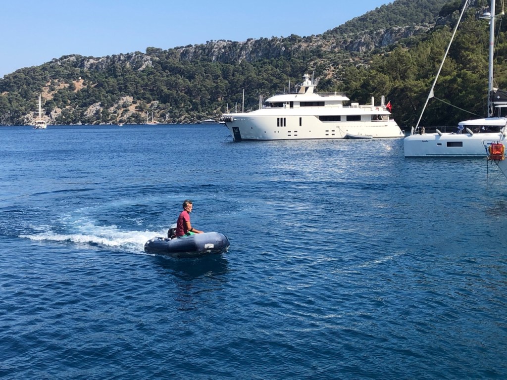 Suddenly – out of nowhere – two angels appeared! Two Turkish sailors who had been tied up close to us at Finike marina had been on a dinghy ride and caught sight of us. They told us that there was space in the cove where they were moored – just ten minutes away – where it was sheltered from the wind that was sweeping into our bay.