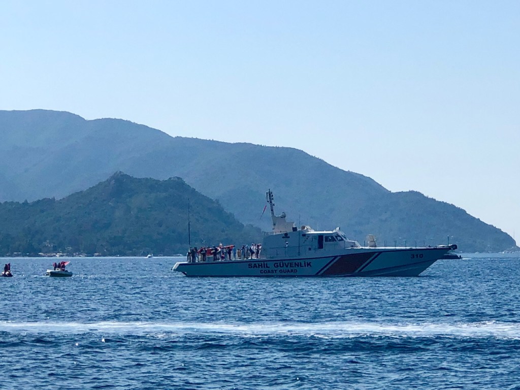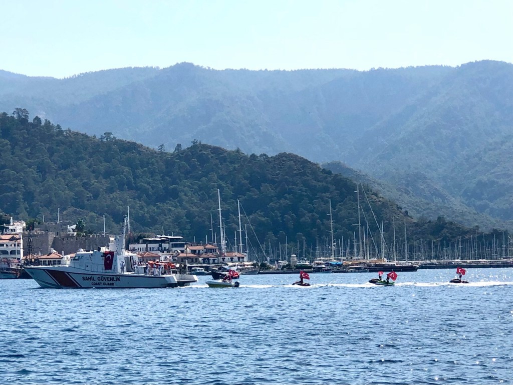 In the midst of all the hubbub, a group of around eight JetSkis appeared with riders holding outsized Turkish flags. They put on a display of what can only be described as motorised version of synchronised swimming! That woke us up!