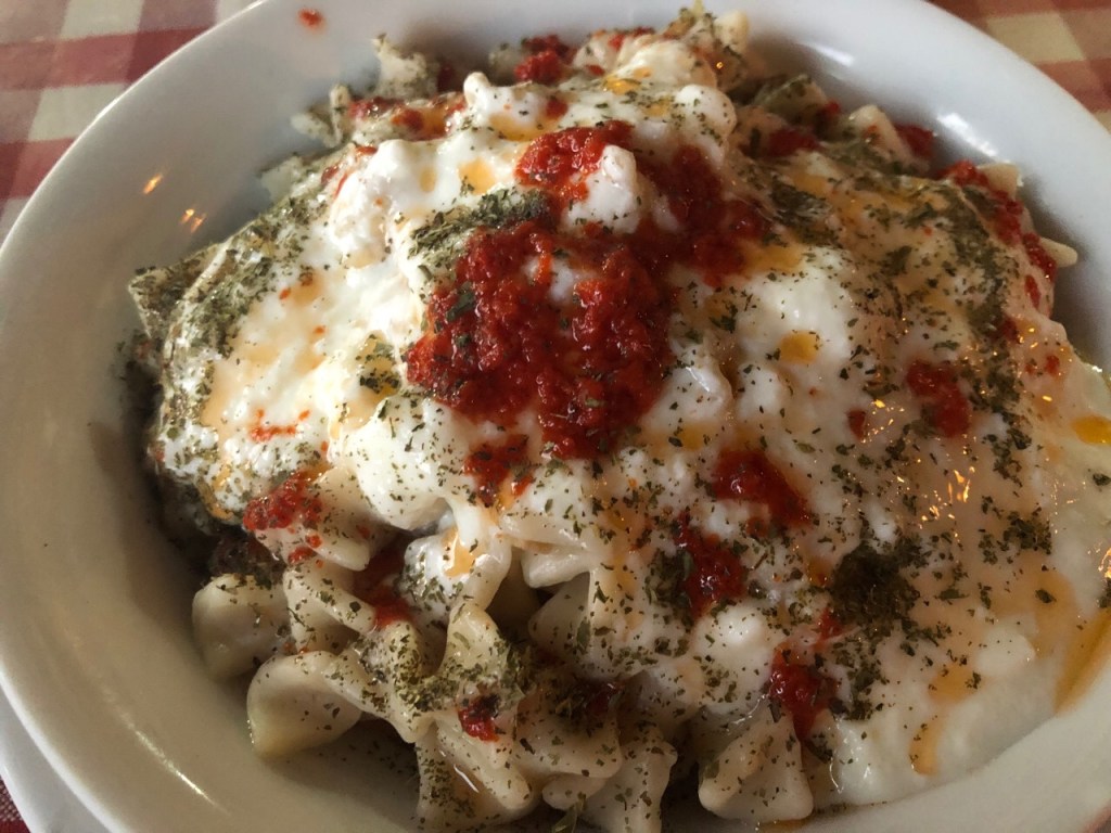 The tiny little pillows were filled with mince meat and served in a yoghourt sauce with a splodge of tomato sauce on top. Delicious but extremely filling!