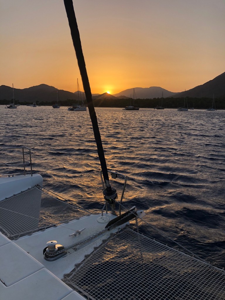 A little later we were quietly enjoying a pre dinner drink when we heard an enormous snapping sound – like a massive whip being cracked or a high pitch thunder bolt. It sounded so close that we wondered if something had happened to our boat. A second crack sent us scurrying on to the foredeck and off towards the shore. Straightaway we could see the problem – the wind had caught Catabella’s light foresail (called a code zero) and caused it to start unfurling. The loud cracks were the sound of the sail flailing in the high wind.