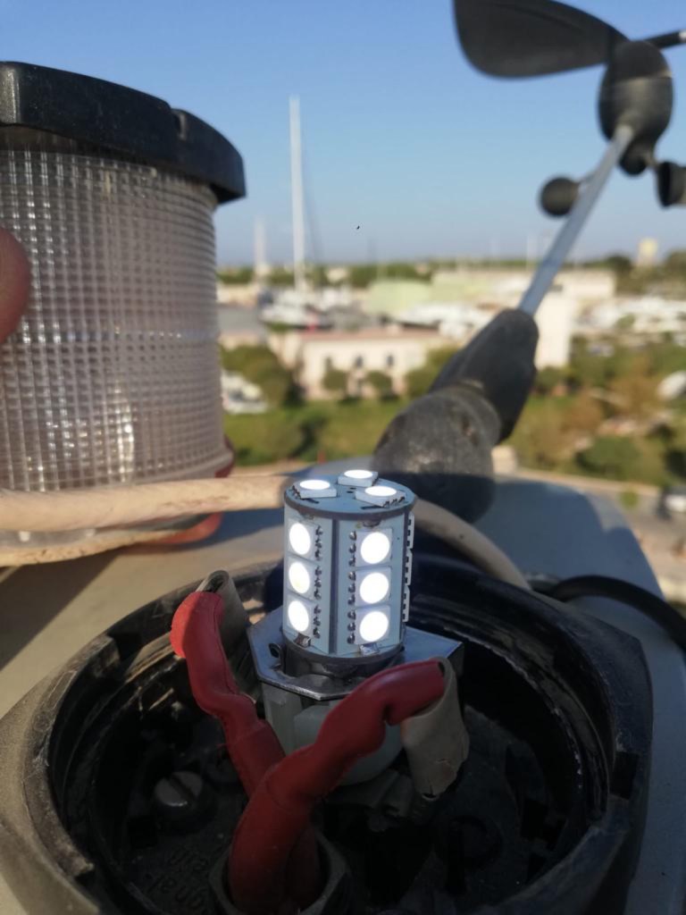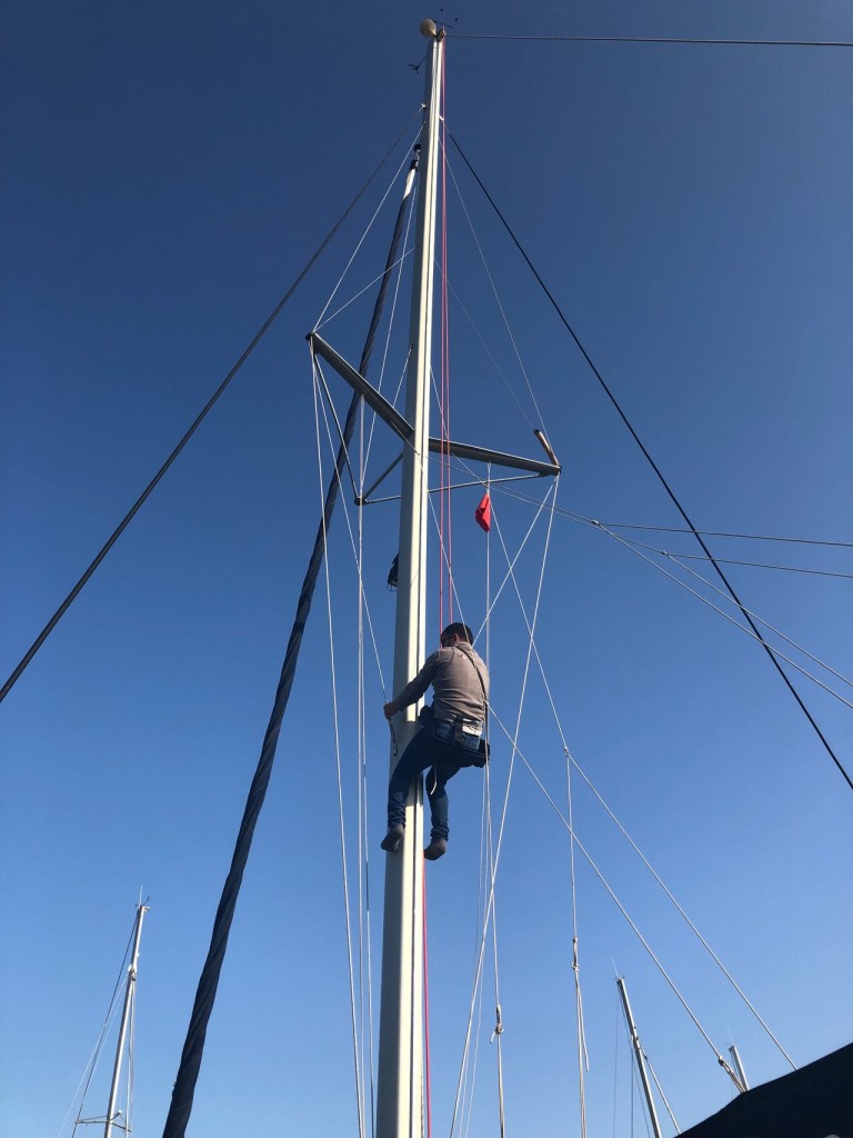 The second company sent a guy up our mast to check our masthead light and replace the bulb. Other small jobs were completed in record time.