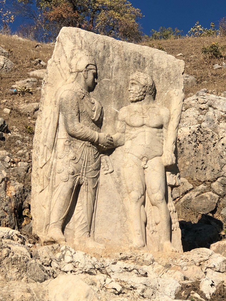 After a reasonably short but steep climb we reached an impressive carved stone block depicting King Antiochus shaking hands with Hercules.