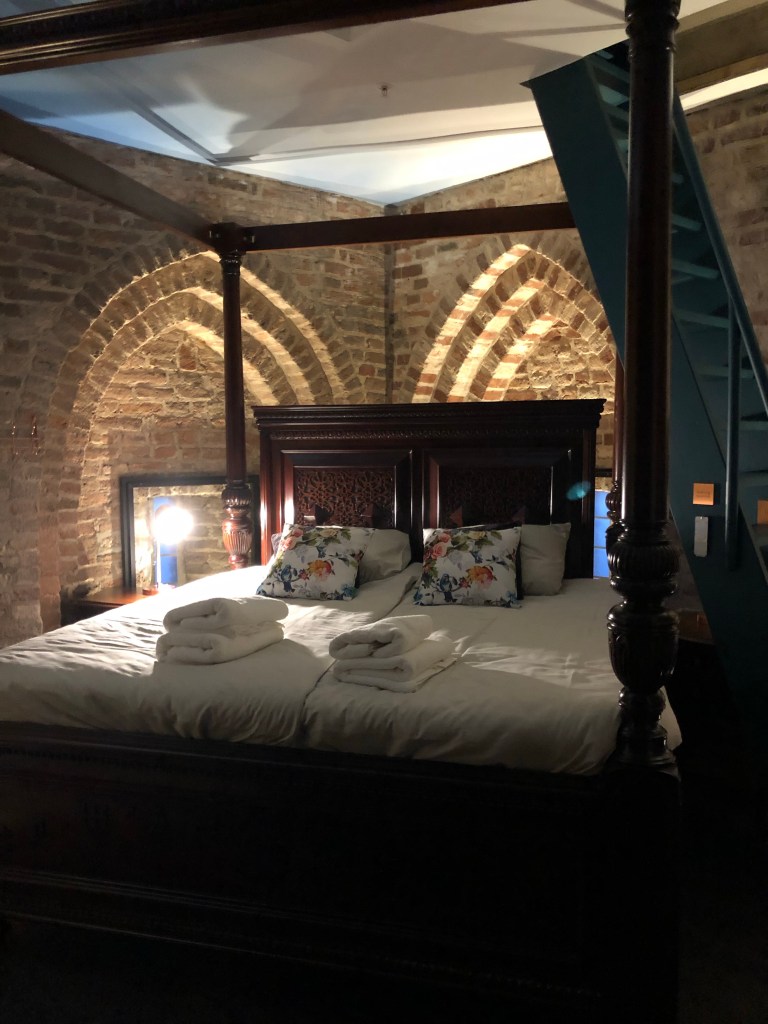 Up another set of stairs a and we arrived at a second tower-shaped bedroom with a fabulous four-poster bed and in one corner a ladder.