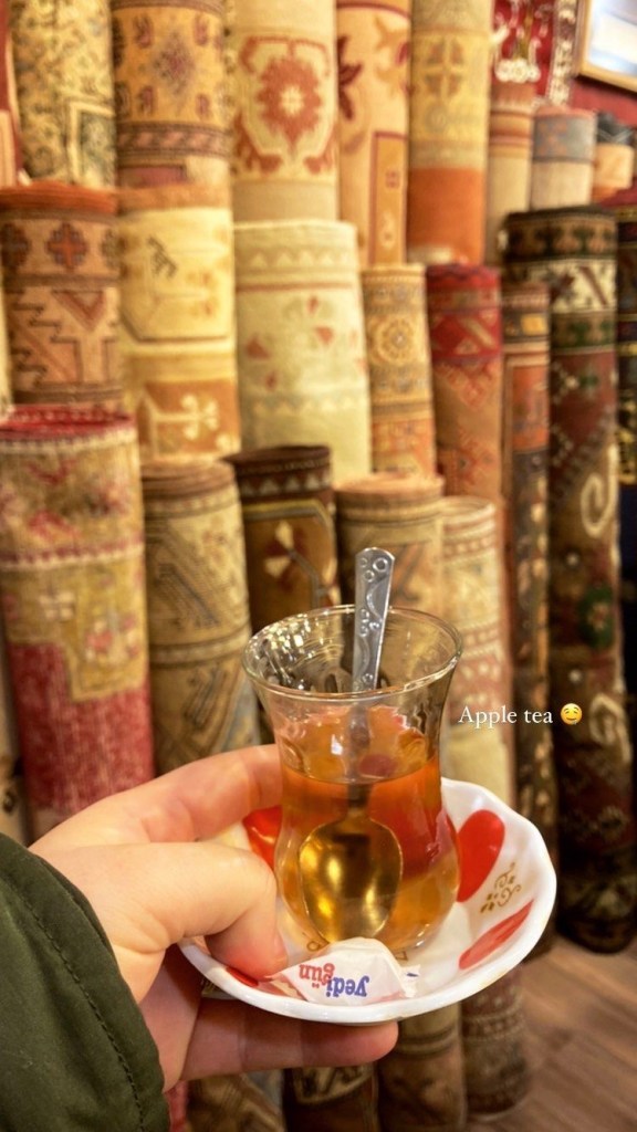 We had a lovely time looking at carpets, eating Turkish Delight, biscuits, drinking apple tea and then later, a plate of fresh fruit from Öztan’s farm.