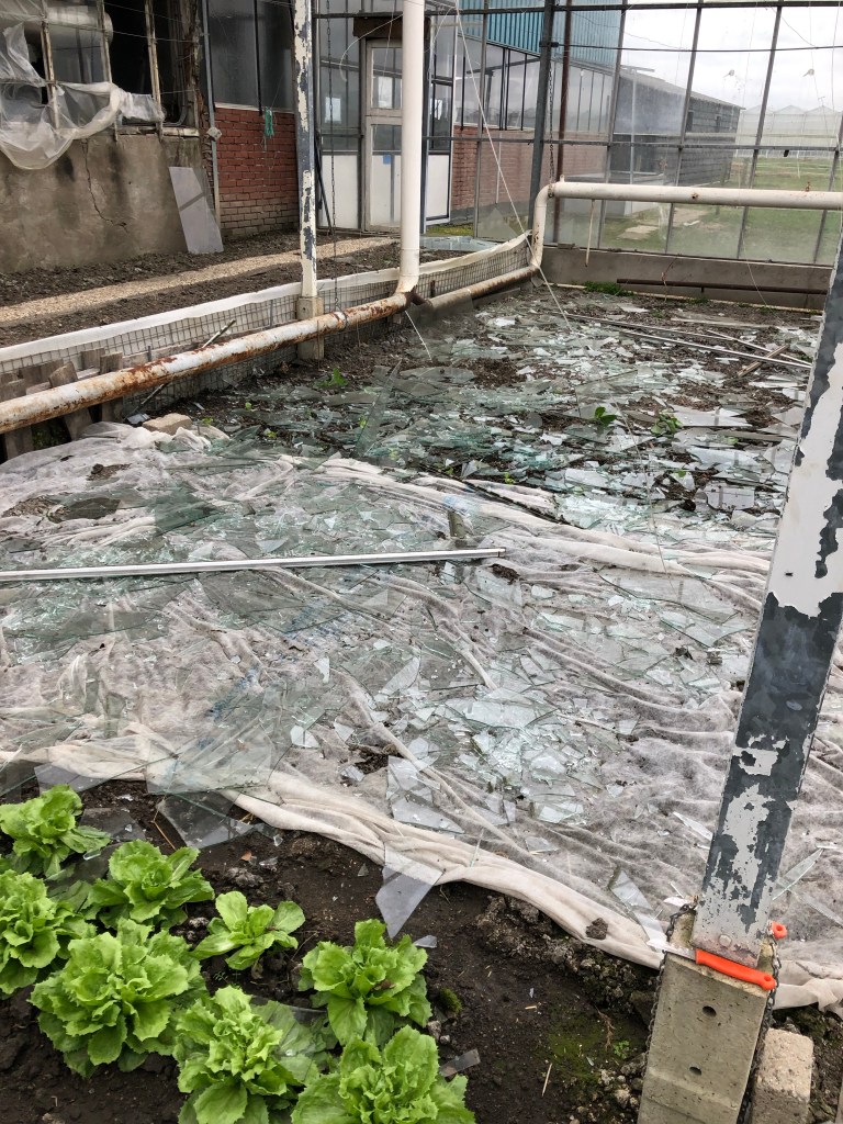 At Pieter’s parents commercial greenhouse several windows were blown in and there was shattered glass, bent frames and gaping holes in the roof.