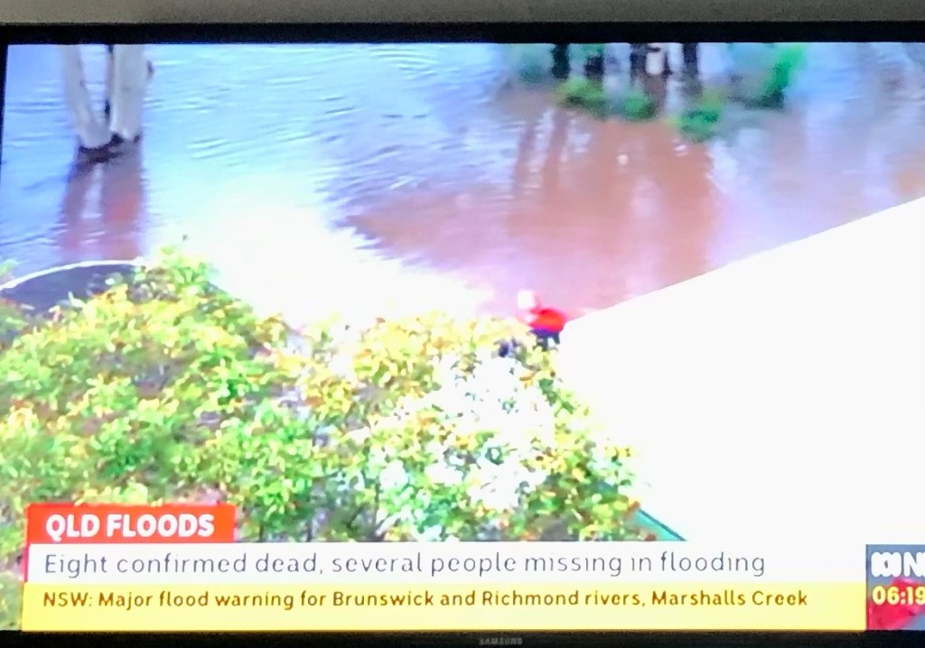 It was so wonderful to see them after such a long time! We all went for a walk down to the nearby Brisbane River. It’s usual, rather easy going, flow had turned into a raging torrent with all sorts of debris floating down towards the sea – pieces of wharf, jet skis, and all sorts of building materials.