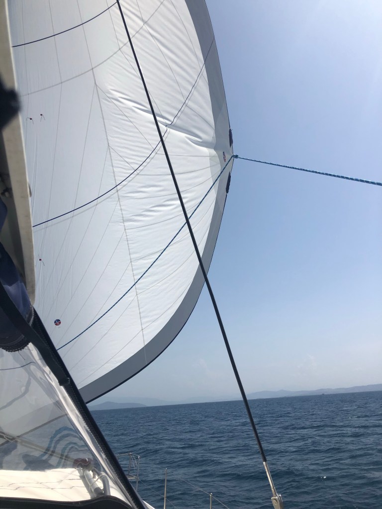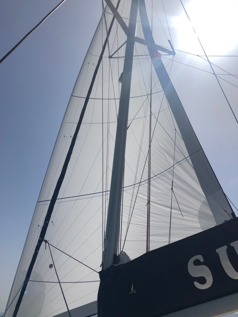 On the way there we were very excited to unfurl our new Code Zero sail for the first time. This large light sail rolled out perfectly and we had a lovely sail despite the light winds – getting to a modest five knots in ten knots of wind which wasn’t bad at all.