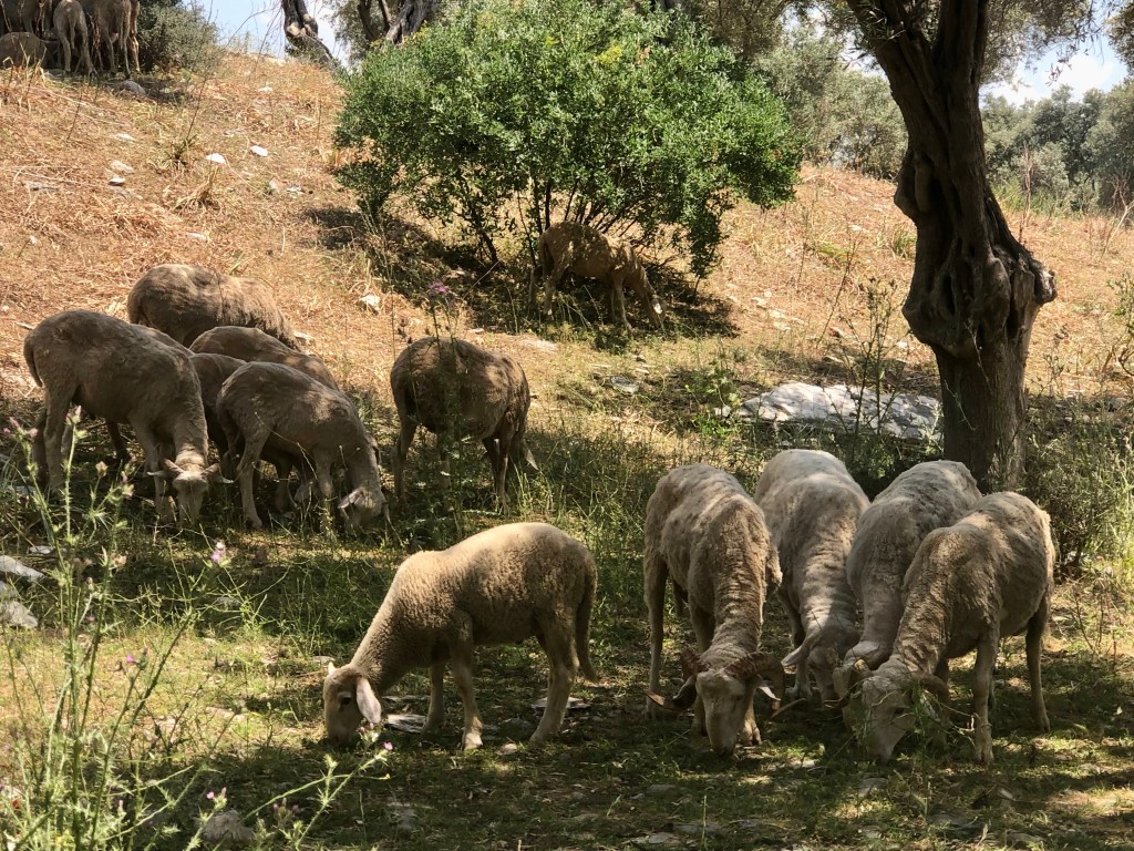 We love strolling between the elderly and wizened olive trees, watching the sheep graze and gazing at the spectacular views, as well as finding parts of the ancient wall that once encircled the whole area.