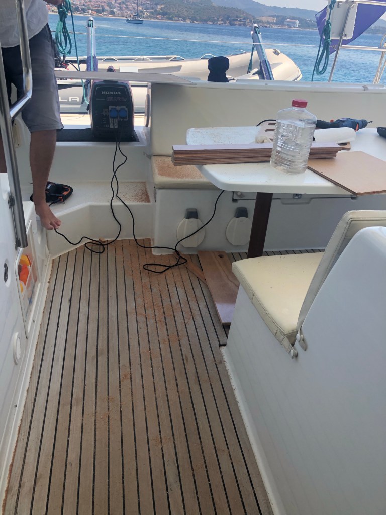 To avoid future disaster he checked the rest of the windows and found that the one in the rear cabin of the starboard hull was also on its way to leaving the hull – so more sikiflex to the rescue!