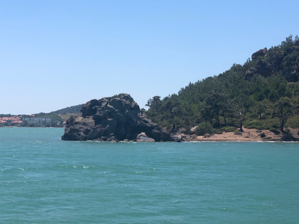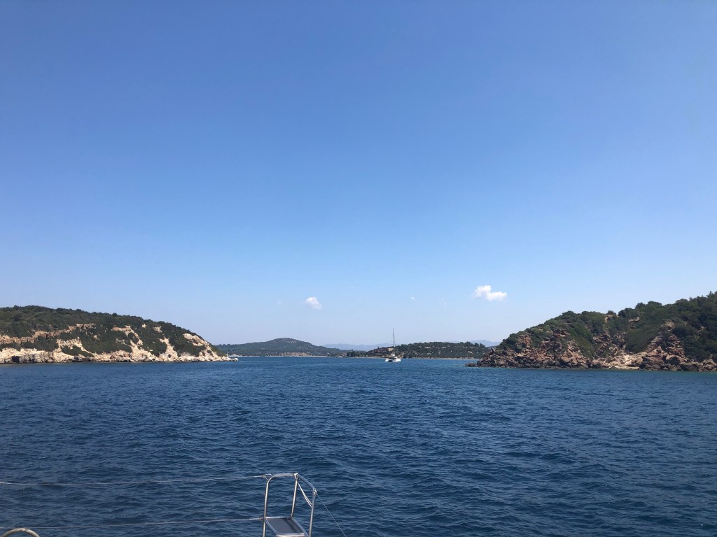 We found the perfect spot – an almost landlocked bay called Çamlik Koyu (Paşa Koyu) where there was excellent holding in mud and beautifully sheltered by steep wooded slopes. We had to go through a narrow gap with jagged rocks either side to enter the bay which looked a little hair-raising but was actually fine.