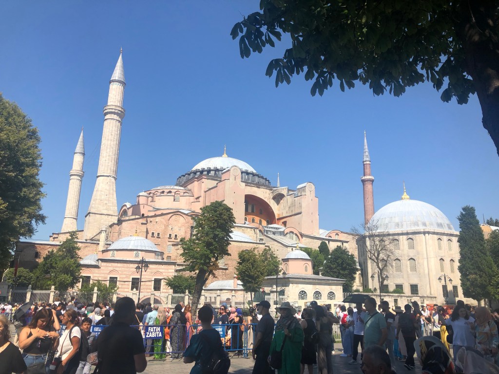 We saw the exteriors of the Blue Mosque (Sultanahmet Mosque), Hagia Sophia (once a Christian cathedral, then a mosque, then a museum and now, controversially, a mosque again) and the Basilica Cistern which was closed for renovation but which is now open again.
