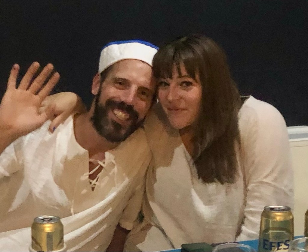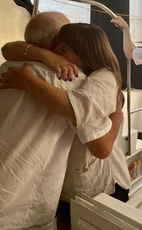 Then Sue came back and told us that we were about to get a big surprise and before we could grill her about what it was, we heard a voice from behind our sunshades saying “Room for two more aboard?” and out stepped our daughter Hannah and son-in-law Pieter!