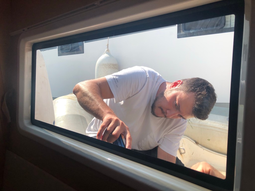 A little later on, Evren, who organised the window fabrication, came to apply the tinted protection/sun proofing to the window. This amazing film allows us to see out but in the day time at least, people outside can’t see in. We tested this while it was being installed by waving and pulling faces inside. There was definitely no reaction from the guys outside who were standing on the dinghy while fixing it up!