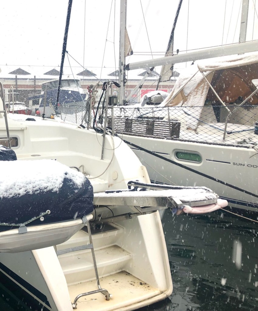 Our lovely taxi driver and one of the marina workers very kindly helped us across the icy passerelle with our luggage and once we had fired up the fan heaters and made a steaming cup of tea, we felt heaps better.