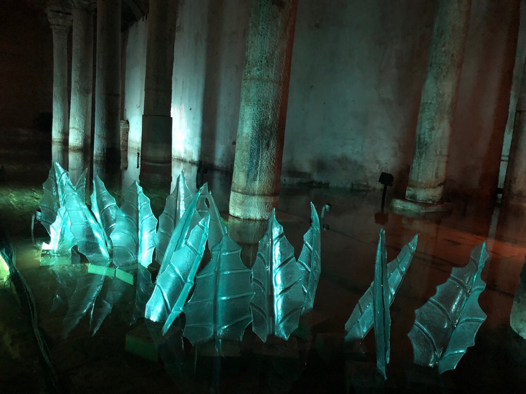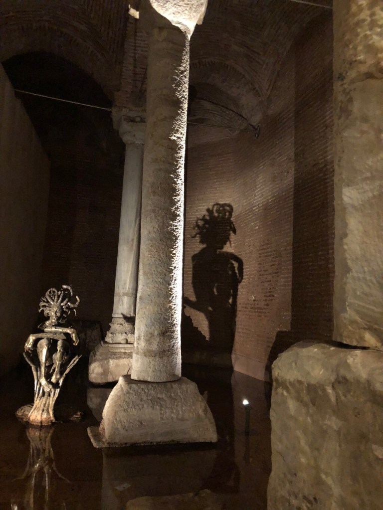 As we wandered around, unexpected modern-day sculptures appeared as the lighting changed – here some jelly fish – there a mysterious goddess-like figure reflected on the ancient wall of the cistern behind.