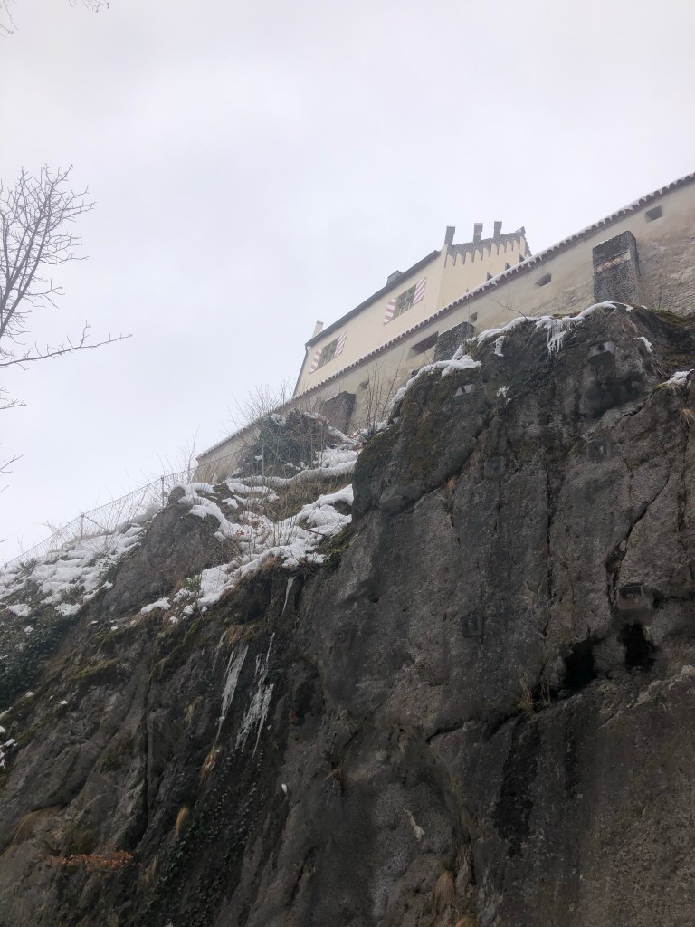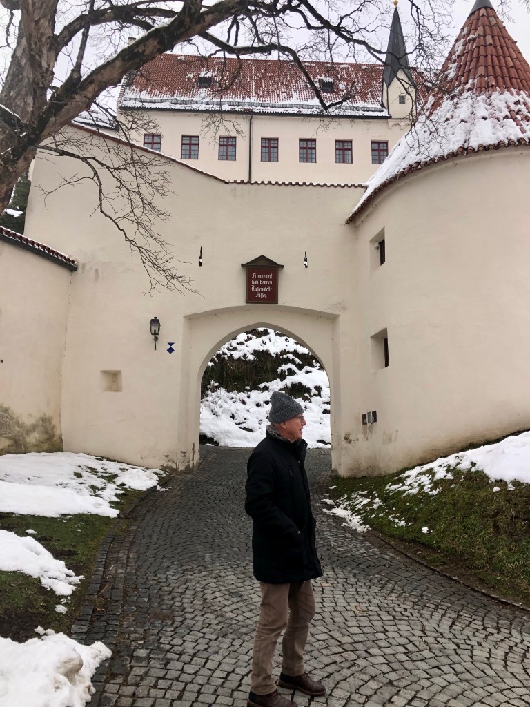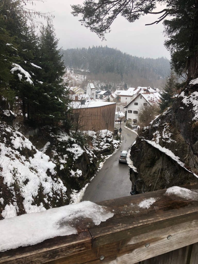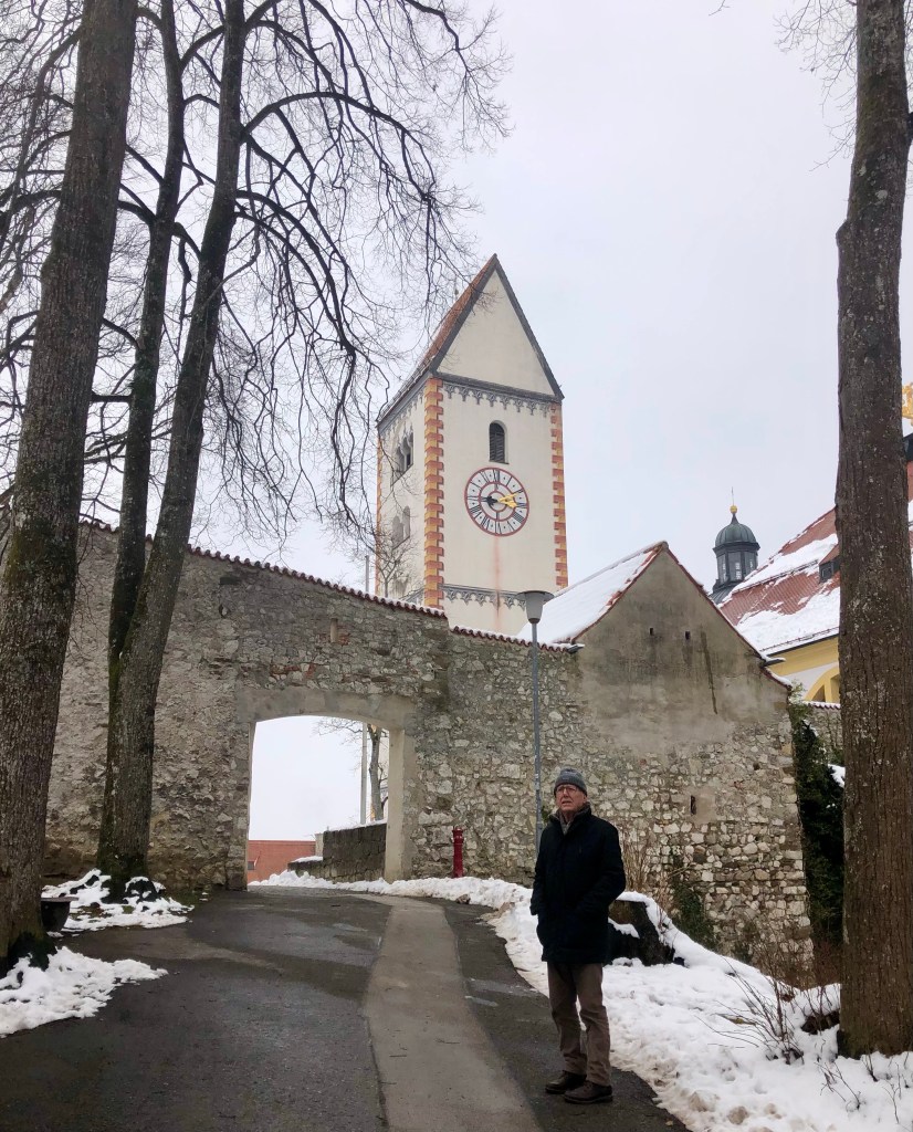 We also enjoyed walking along the battlements to the clock tower and climbing up the wooden stairs to the top of the tower where we had a great view of the snowy rooftops of Füssen.
