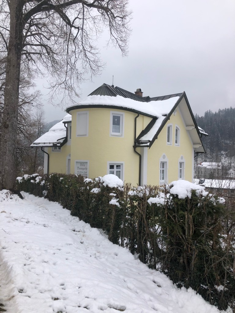 We walked back “home” to the van through the very snowy and slightly slippery wooded park, passing a beautiful villa painted in a very pleasing pale lemon.