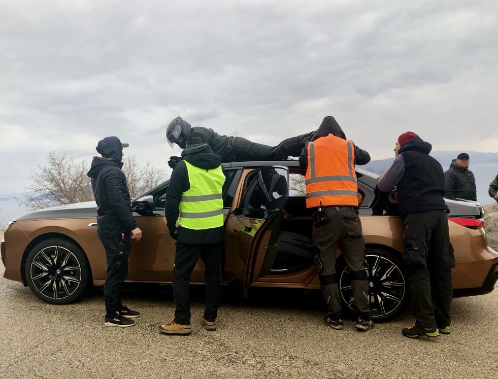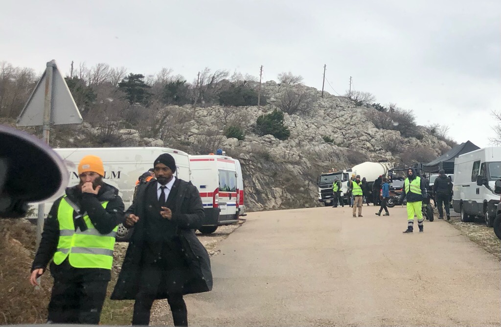 We passed a “heroine” shrugging on a fur coat to cover her skimpy dress, extras hanging round a food van, film equipment, someone with climbing gear on and another guy lying on top of a car surrounded by a group of people setting up a shot.