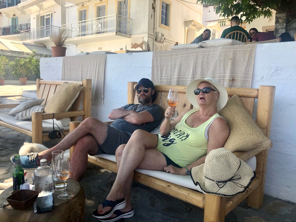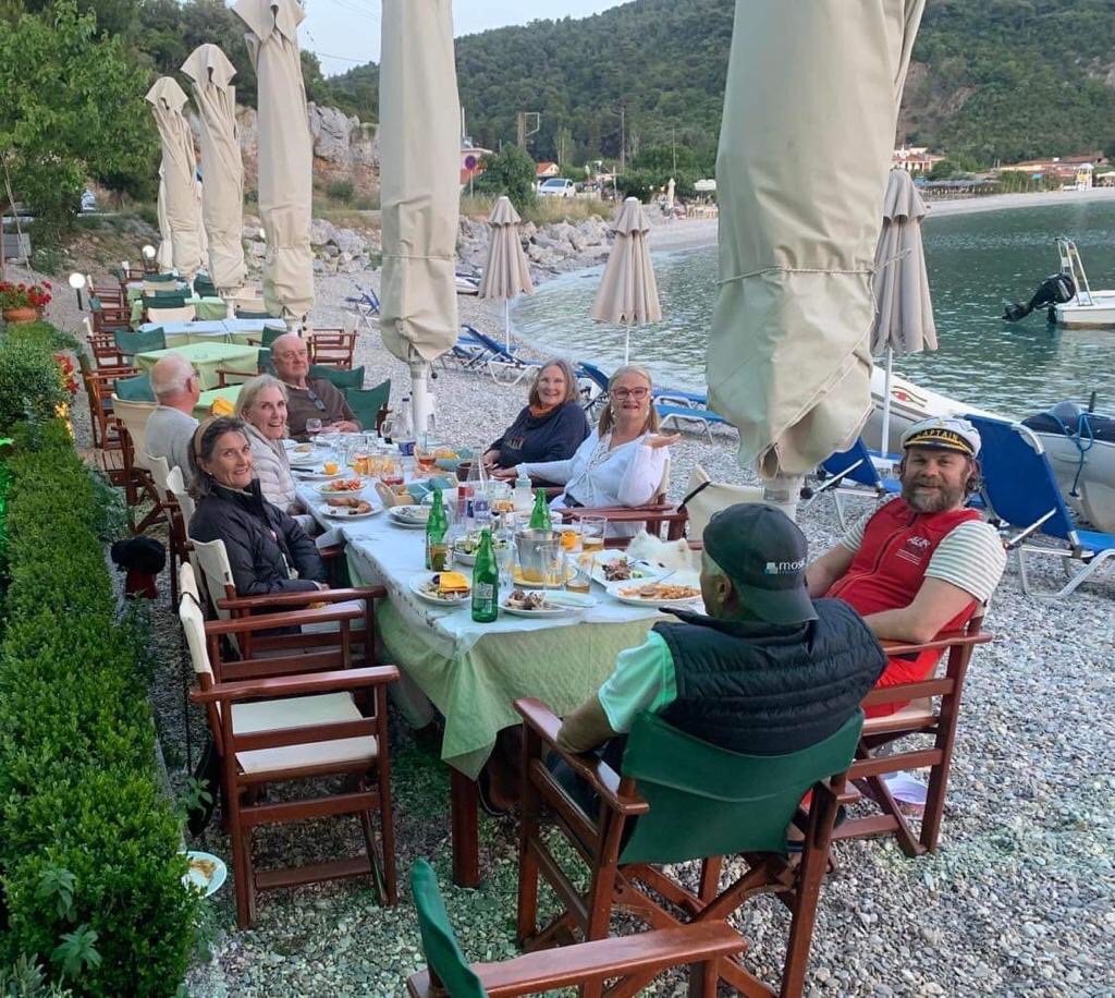 After drinks on the deck to the soundtrack of Mama Mia, and a couple more in salon, we all headed for Panormos Beach to a restaurant right on the beach where we enjoyed an excellent meal.