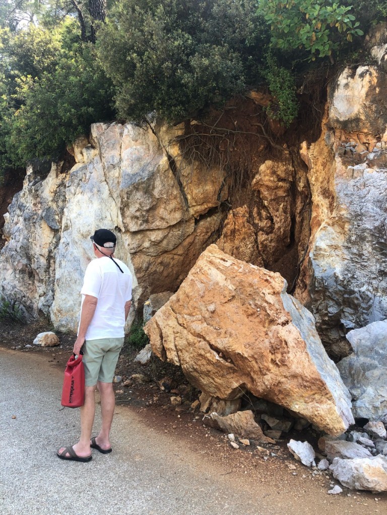We motor sailed round to Panormos Bay and as Catabella had already anchored and tied back to the rocks, the crew were able to help us tie up. It’s very hard to do this when there are only two of you.