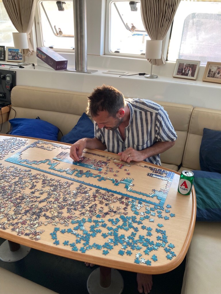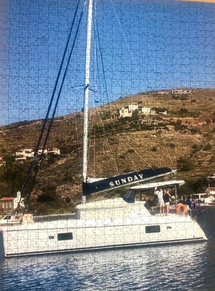 Talking of fantastic gifts, I had asked Sue if she could bring us a jigsaw puzzle back from her travels for Pieter as he loves puzzling when on holiday and I wasn’t at all sure that I’d find one on a Greek Island. (I did find one in actual fact! Between Sue and Lisa and Andrew, they cooked up the idea of having a jigsaw made of Jonathan and I aboard our catamaran!