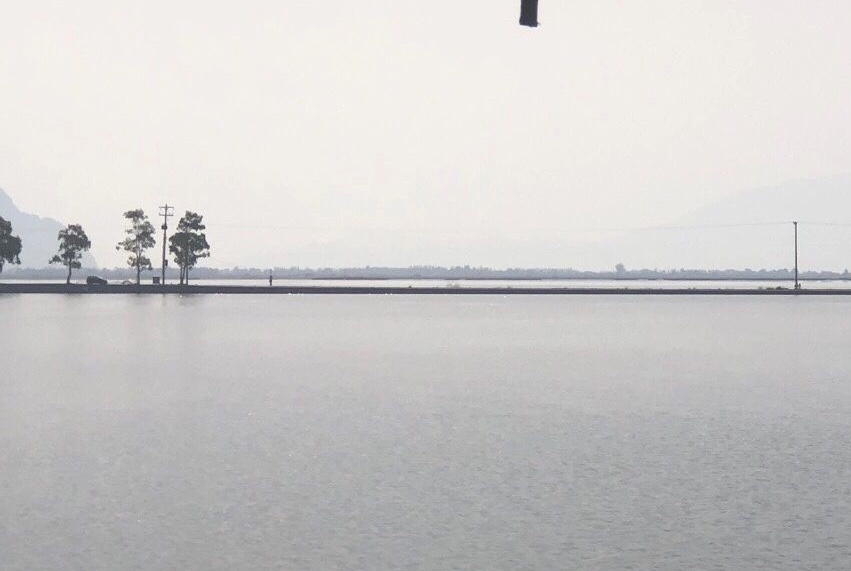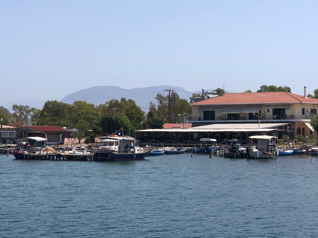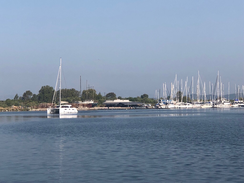 But I digress. We entered from the Gulf of Corinth through a narrow entrance and motored along a channel which was well marked thankfully, as on either side we could see shallow, murky, water, and fishing nets and traps and in one part, a two-lane road sitting on a dyke (just like the Netherlands!).