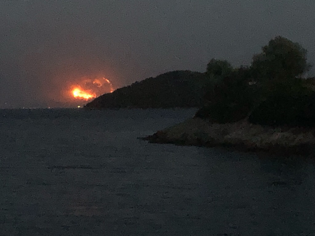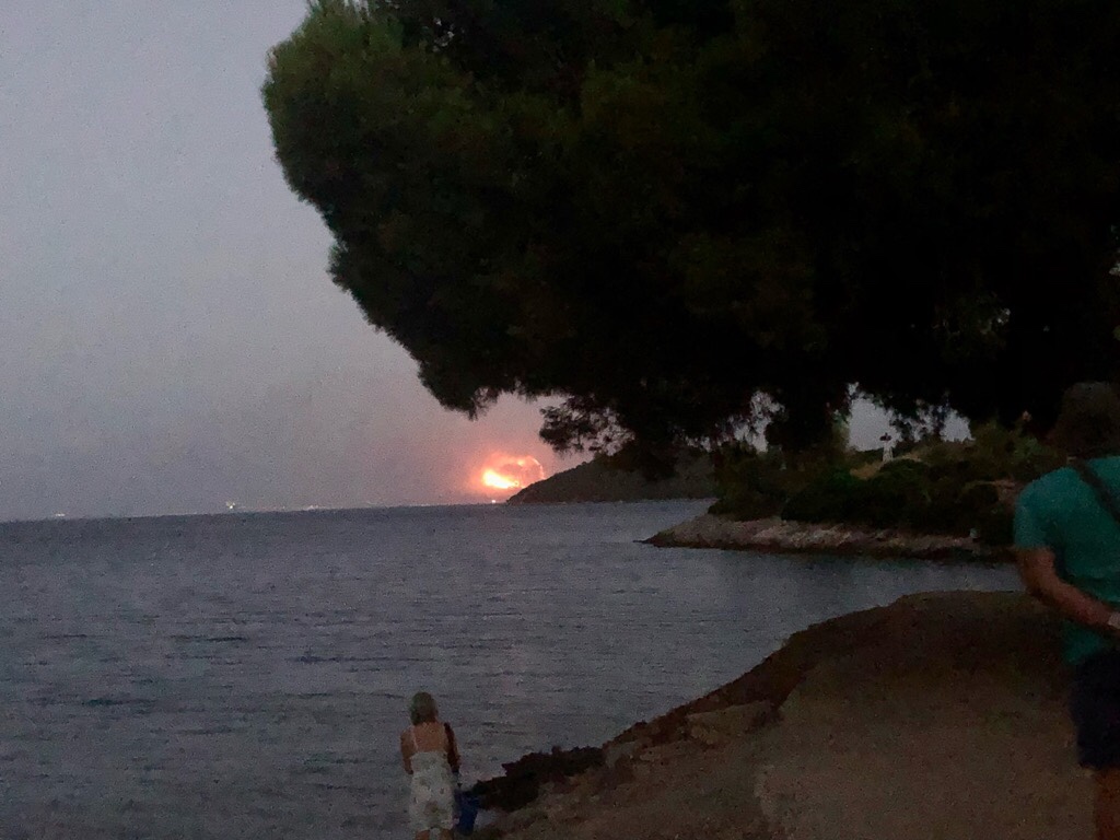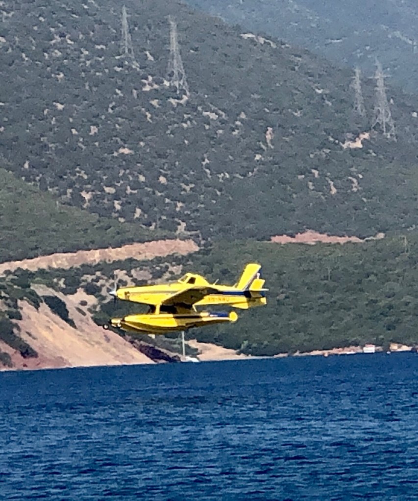 During the day we had watched with bated breath as three purpose built water carrying aeroplanes flew down right in front of us scooping up big loads to drop on the nearby fires.