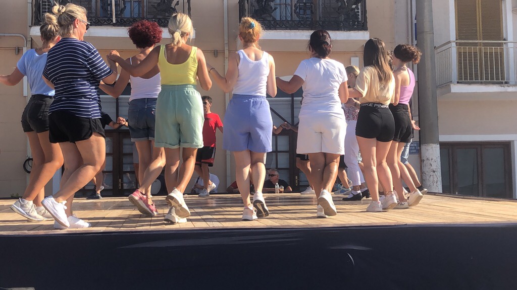 We then crossed the funny “wavy” bridge to the mainland and walked towards the town. On the way we heard some traditional Greek music playing and came across a large group of dancers – men and women- in a circle. We later learnt that they were rehearsing for a performance that night but I enjoyed watching them and listening to the musicians weave their magic.