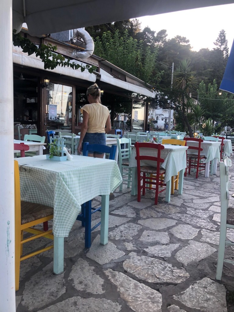 At the end of the seafront promenade – just before the small “town wall” where boats could tie up – we sat down at a taverna for a glass of wine.