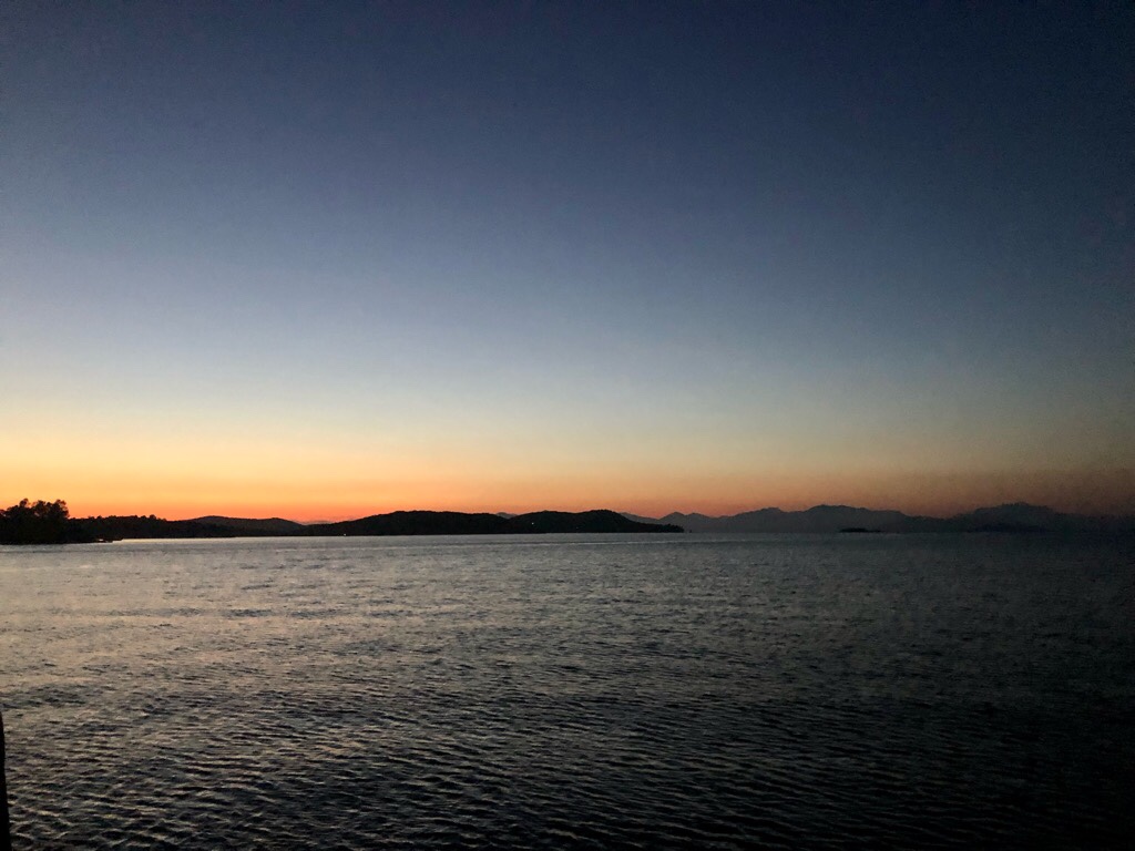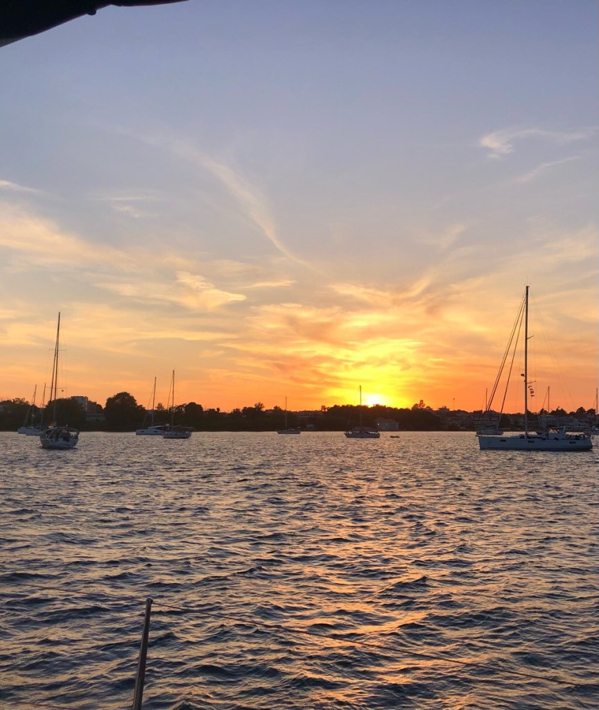 After Jonathan had rowed to the shore to collect us we decided to have drinks on the foredeck and watch the sun go down.