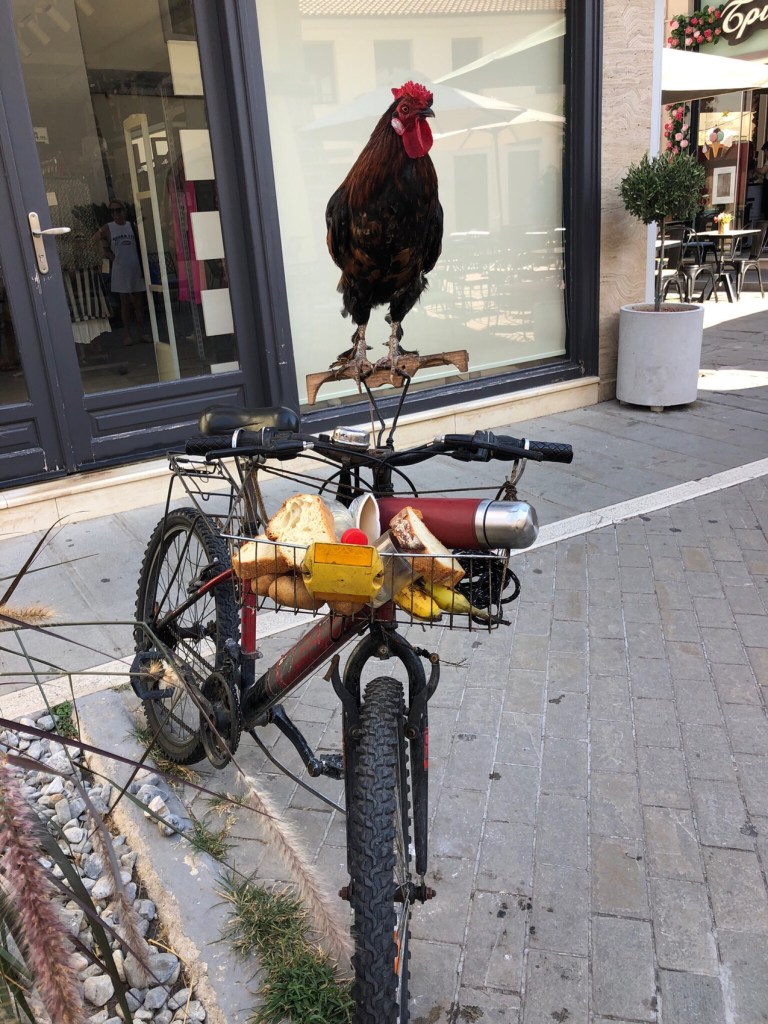 Then we suddenly caught sight of a big black and handsome rooster sitting on a special perch on a push bike! He was someone’s pet and was doing a great job of guarding his master’s property!