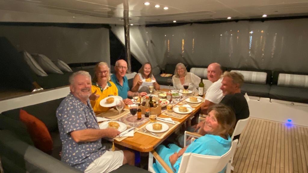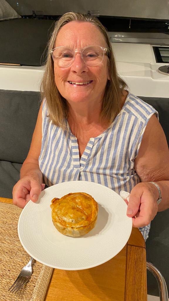 We were anchored close to our buddy boat Catabella and other friends, Peter and Deb aboard their Lagoon motor catamaran Entre Nous. One evening Deb and Peter threw an “Aussie” pie night which was a great event.