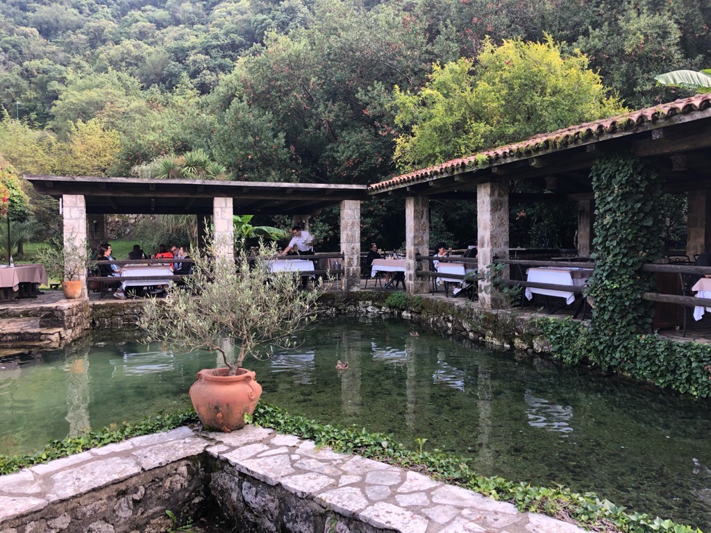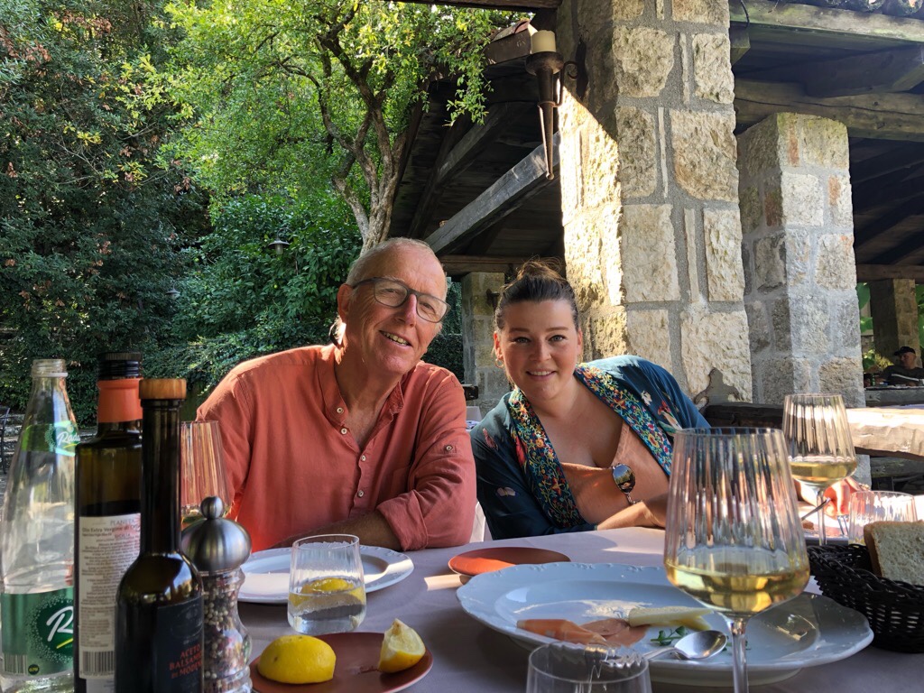 Once anchored, and after a bracing swim, we took Hannah and Pieter up the shallow inlet with the low bridge to the gorgeous restaurant set in the fabulous grounds of an old mill.