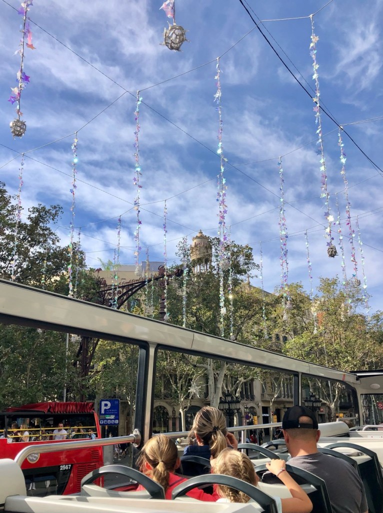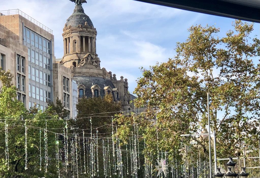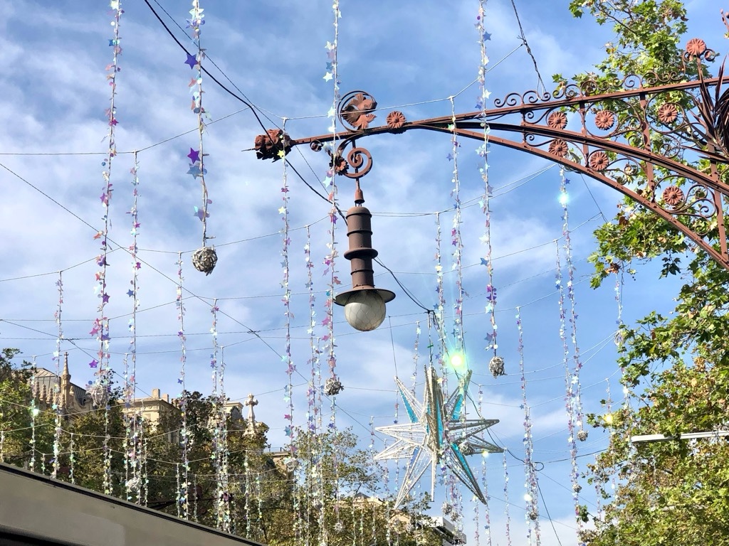 What a gorgeous city Barcelona is! And what better way to see the stately apartment buildings, the shady plane trees, the Gaudi masterpieces, the artworks by Joan Miro and others, the former bull ring (now a music venue) and all the other wonderful sights – including some amazing Christmas decorations sparkling like shards of ice in the sun.