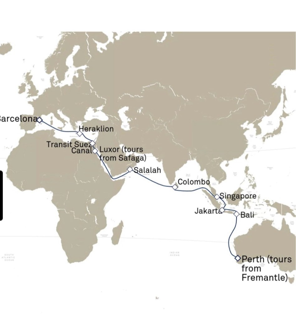 At long last it was time to board the Queen Elizabeth for our 28 day voyage from Barcelona to Perth, Australia.