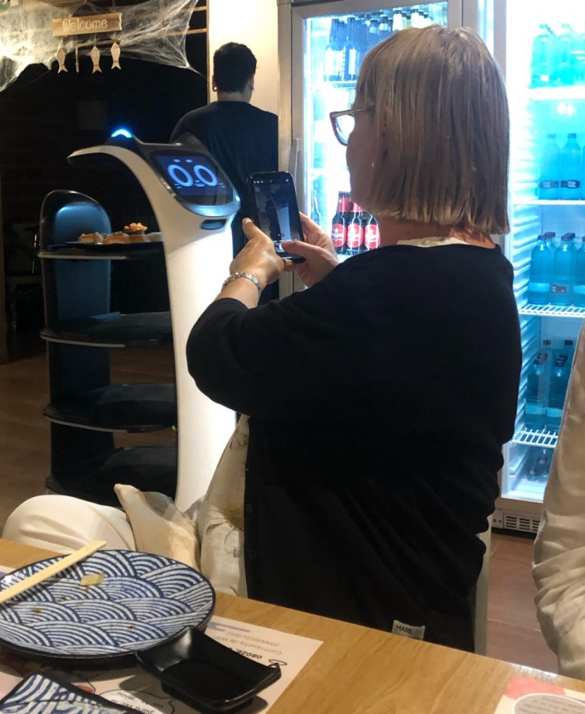 The food was great and the service excellent – because it was supplied by a robot! After we had placed our orders the robot collected the dishes and stopped at our table, opened up the tray and we took our plates! All very efficient.