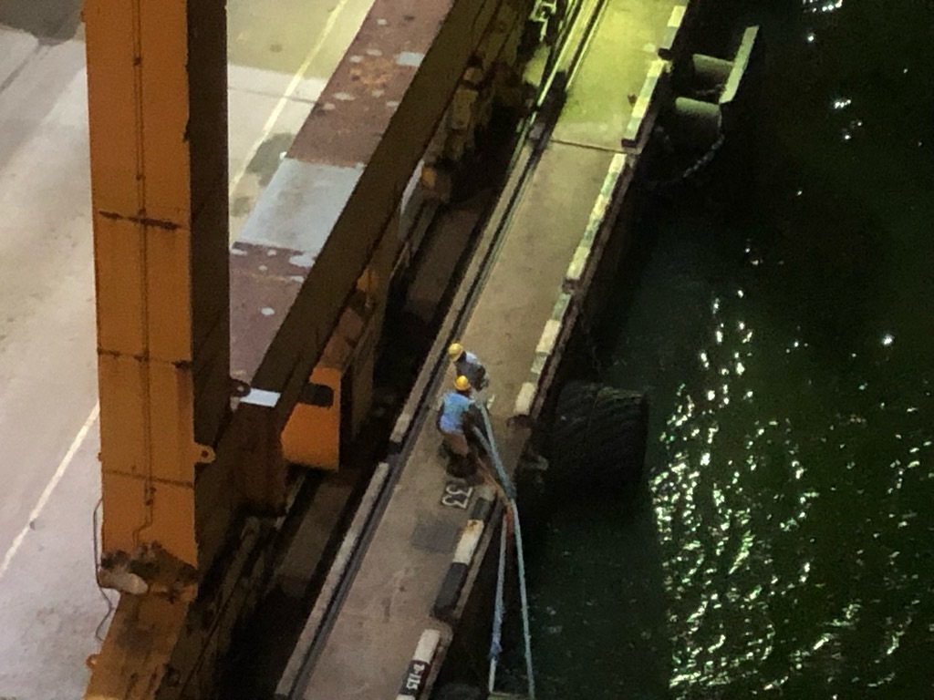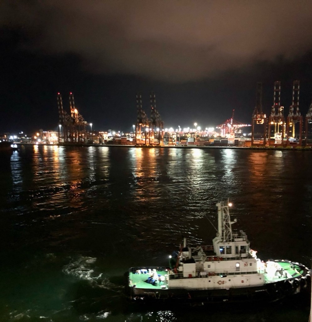 The ship’s departure was an impressive sight – tiny figures heaving her massive lines off gigantic bollards, the dead slow and very gentle sideways propulsion off the quay and the arrival and departure of the pilot boat.
