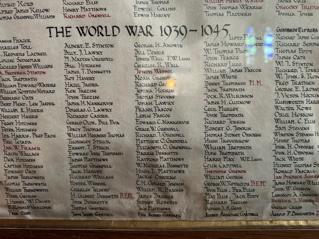 While we were in the church we noticed a framed parchment with the names of local men who had fought in World War ll – both Jonathan’s uncles were mentioned and in the case of our son Ben’s namesake, the initials MM which stands for the Military Medal, were inscribed next to his name.
