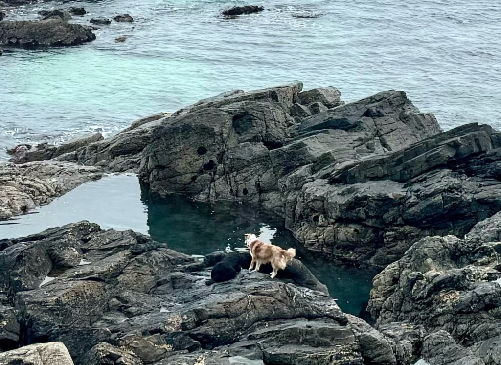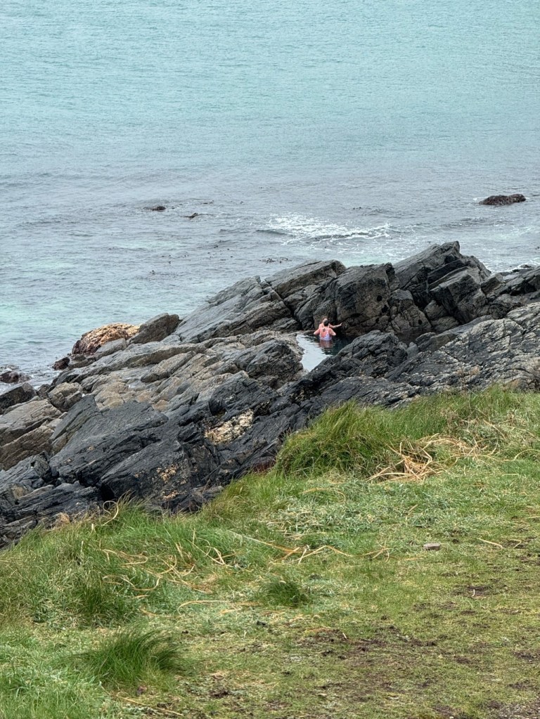 They were on the rocks clambering towards a big rock pool and as I watched them make their way towards it (and the dog running up and down) I noticed a women floating on her back in the calm water of the pool.