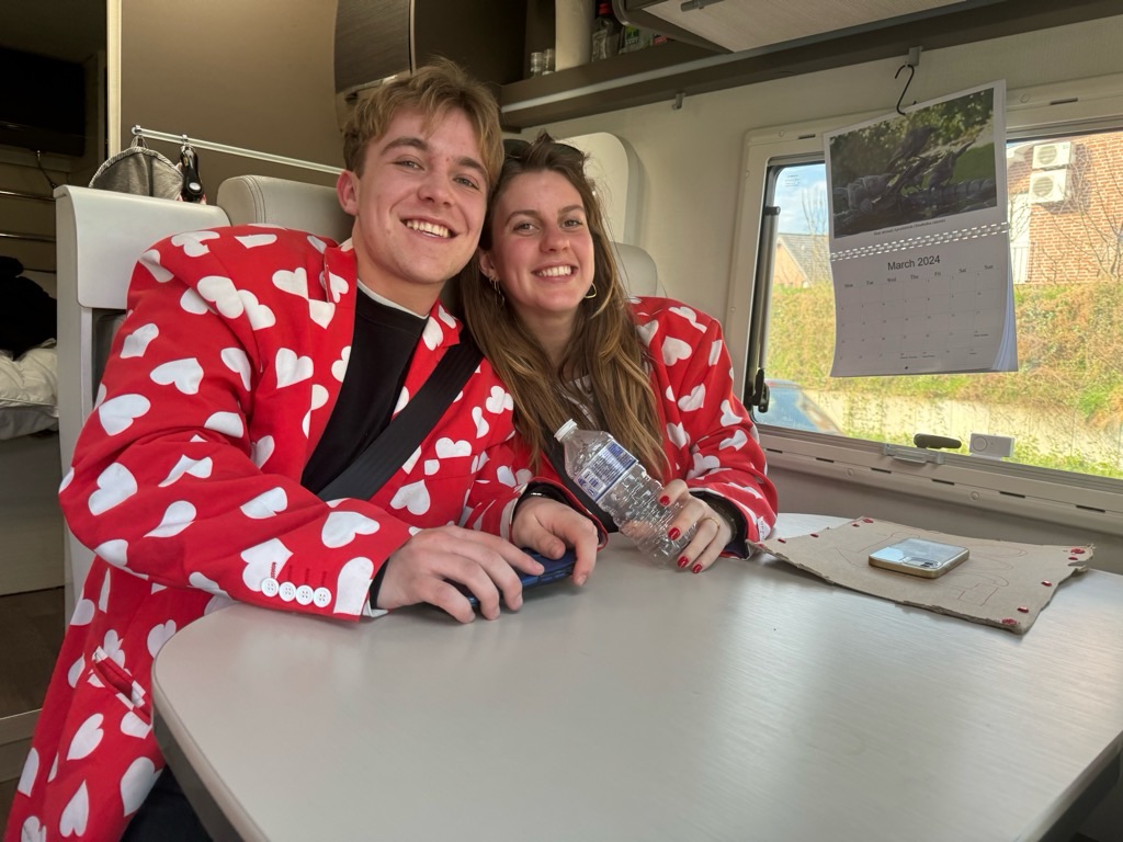 He seemed to be taking a really long time but eventually I saw in the distance walking back to the van with a young couple – dressed in red blazers with white hearts emblazoned all over!
