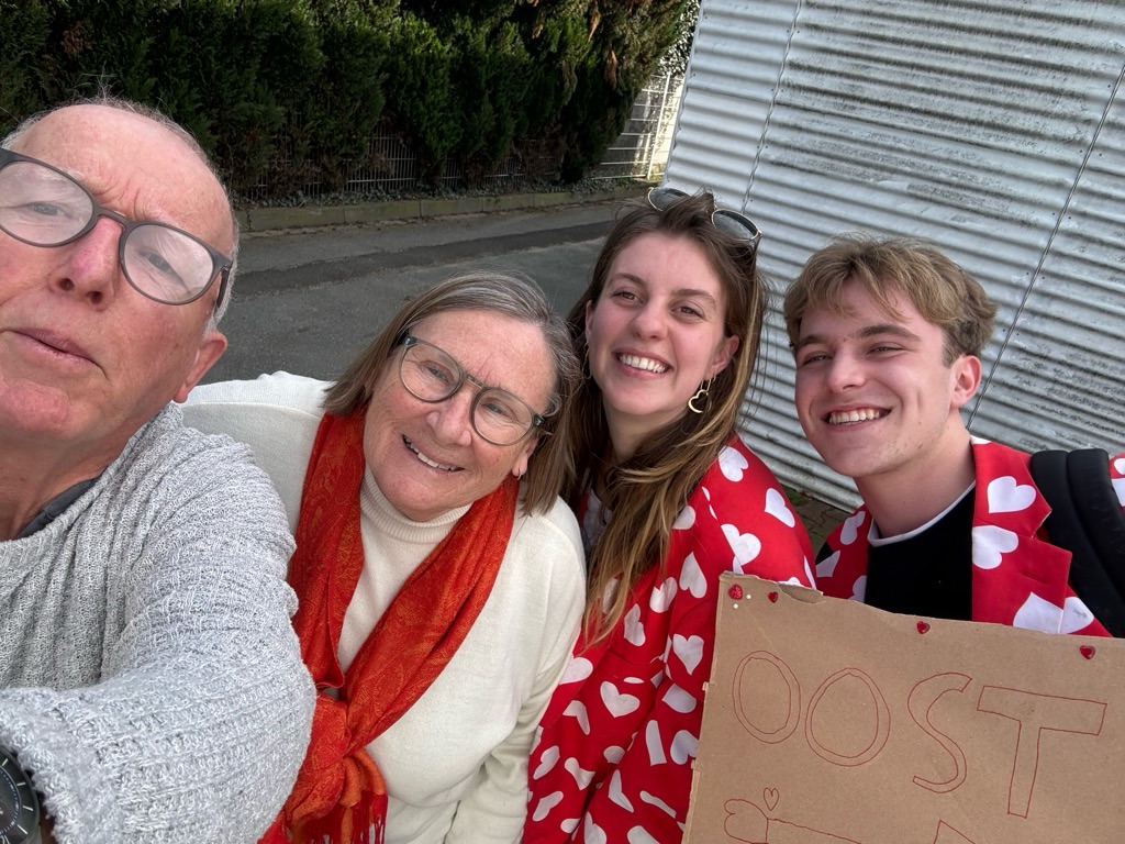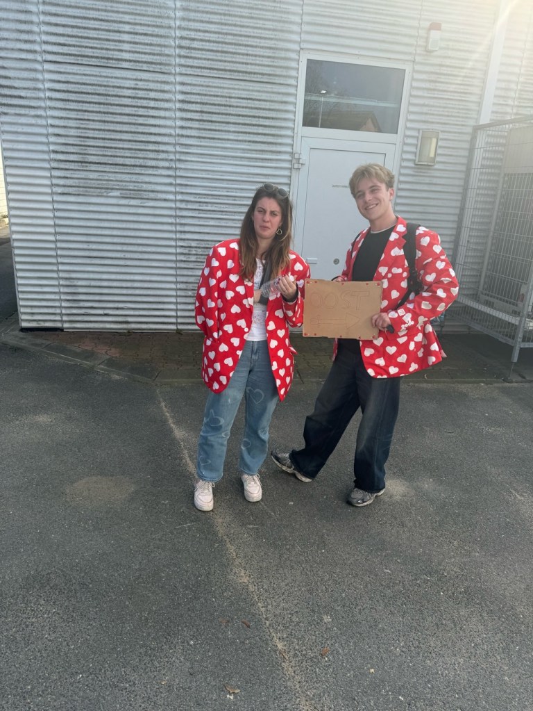 It turned out that they were students at the University in Lieden and they were taking part in a game/contest which involved hitching their way to Munster in Germany from Lieden.
