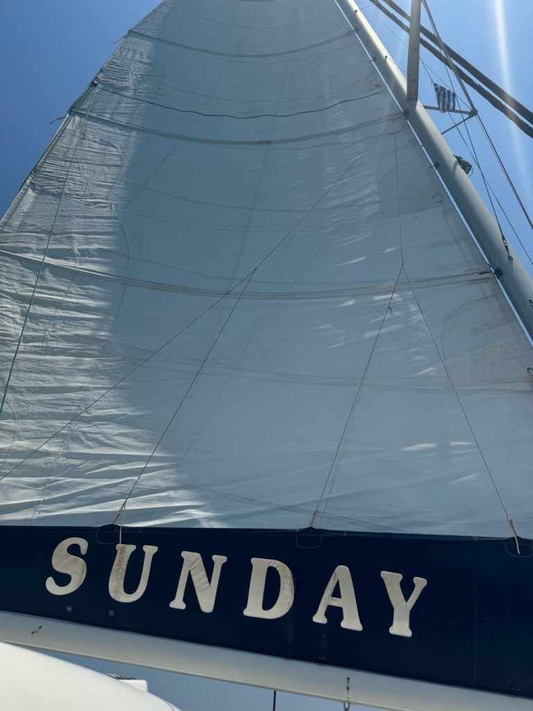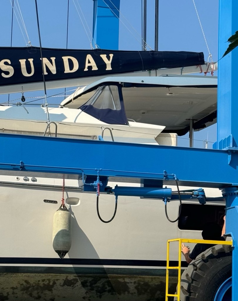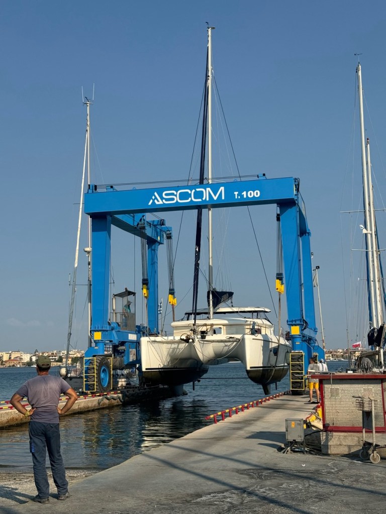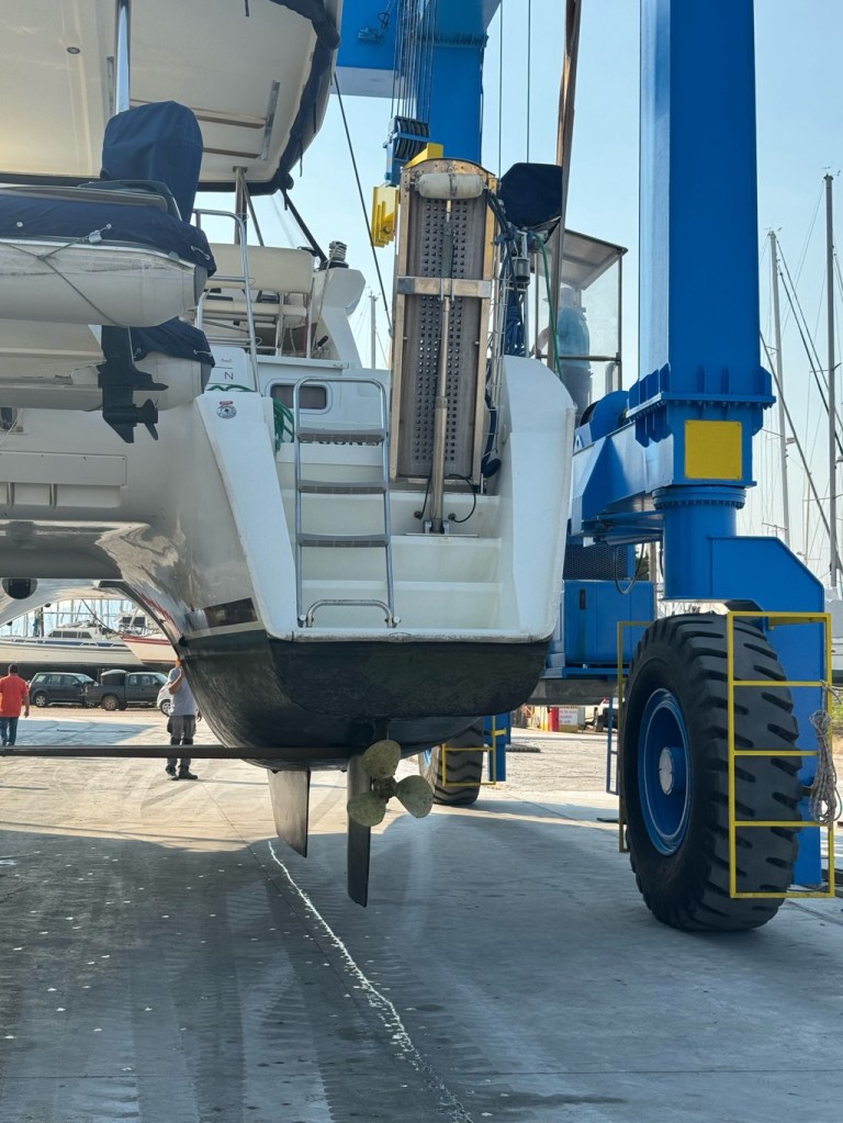 The surveyor started his work bright and early. It was a sizzling hot day and we were all feeling the heat. The first part of the survey was conducted with Sunday in the water and the following day she was lifted at Aktio Marina – the lift was executed very efficiently, expertly and speedily.
