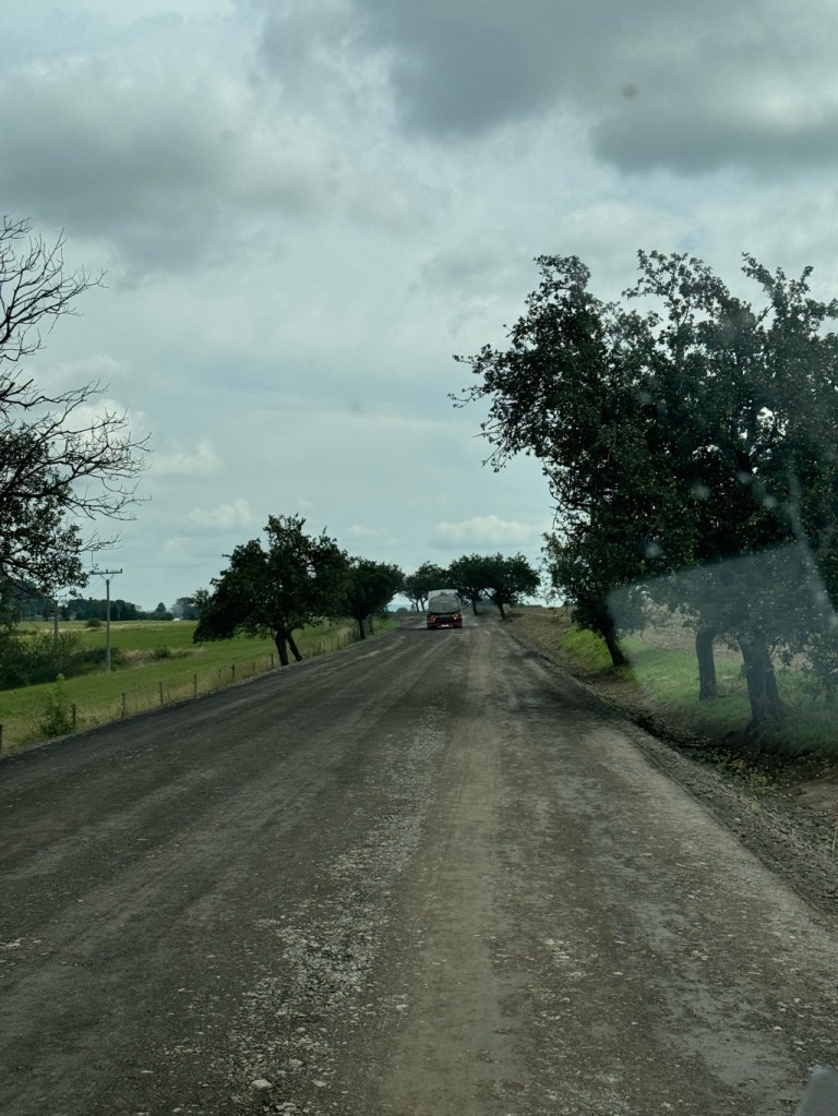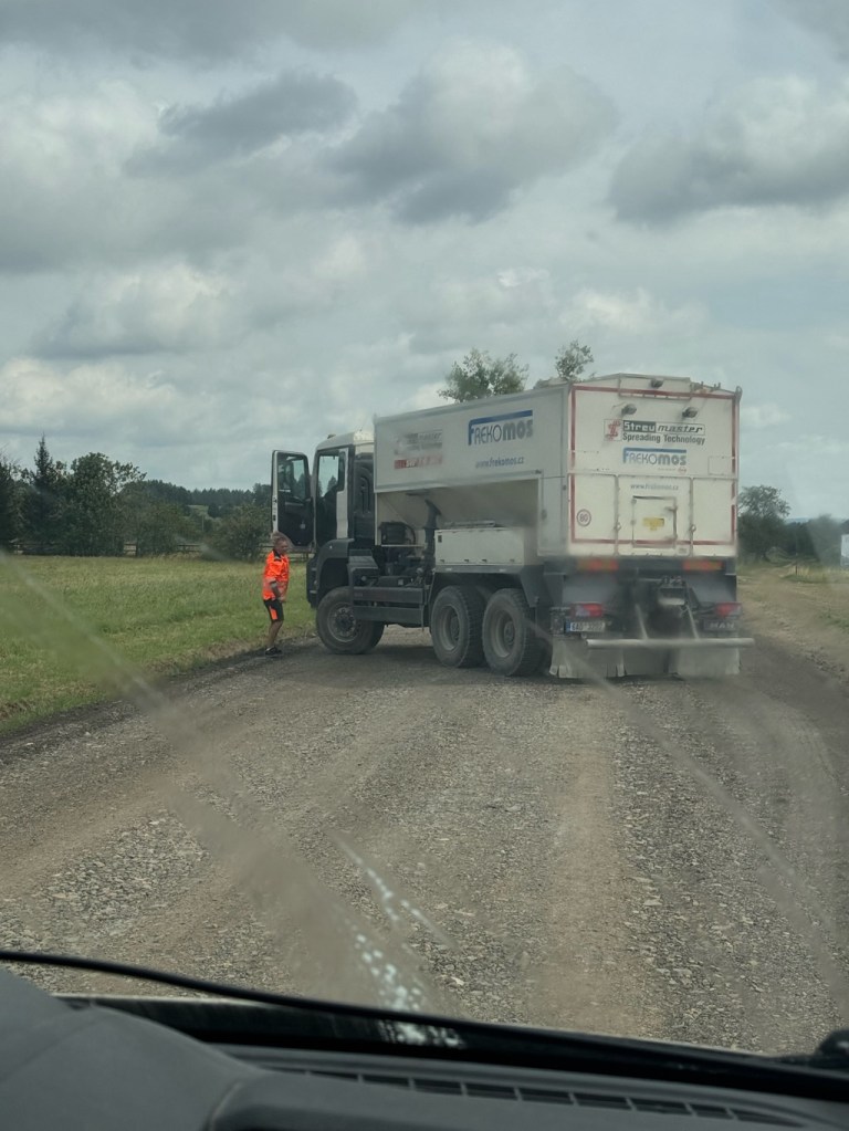 Around lunchtime we found ourselves in the middle of nowhere driving along (as you do) when suddenly we came across a team of road workers, no road and big trouble!
