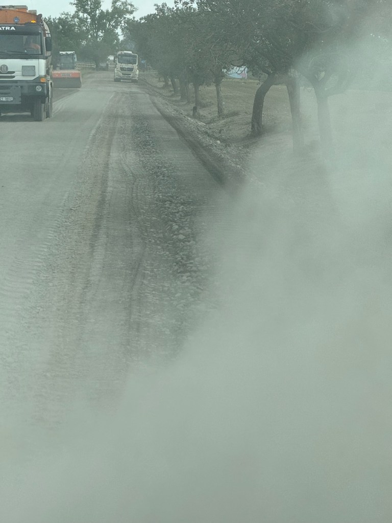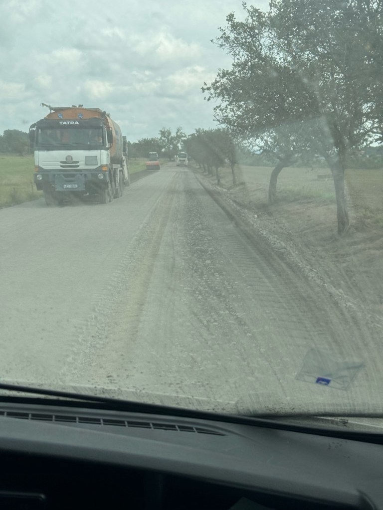 The driver looked confused but manoeuvred to one side to allow us to continue along the now non-existent road. We edged slowly forward and as we did so we were enveloped in a massive cloud of choking, ultra fine, dense grey dust which we then realised, had just been spread and levelled by the road grader.