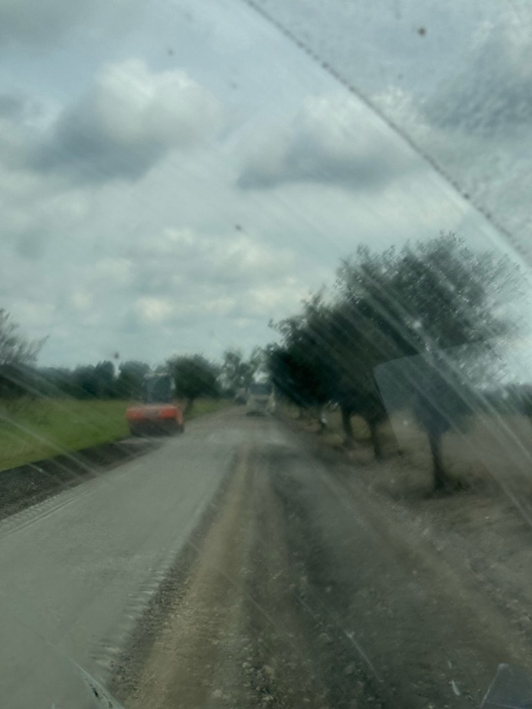 He proceeded to take photos of us and then appeared to make a phone call. What could we do? Going back would only increase the damage to the road work – our only option was to edge around his truck and move slowly forward.
