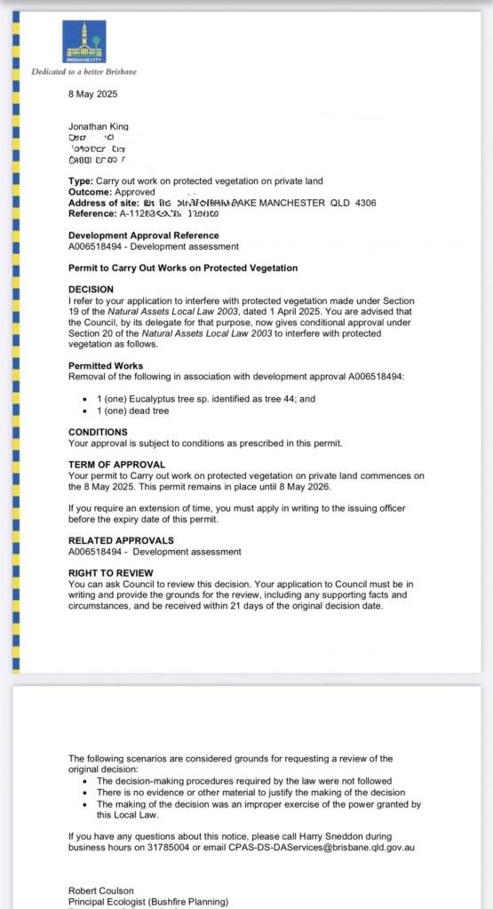 The report had to then go to Council and eventually we finally received our “Carry out work on protected vegetation” permit.