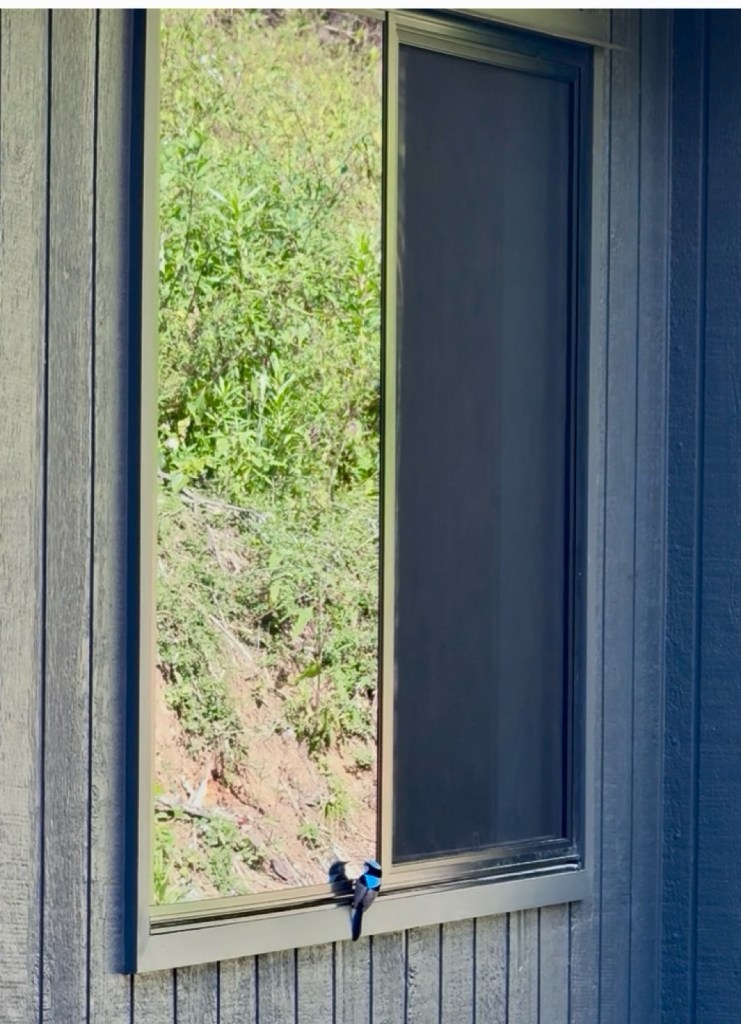 We had one little visitor who wasn’t very pleased about the arrival of the house – a sweet little blue fairy wren that had caught sight of its reflection in one of the windows. Poor thing kept bashing into the window- attacking “the intruder” until Jonathan fixed up a sheet to hide its reflection.